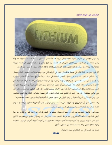 أميلويد فيها ،وازدادت أيضاً كمية بروتين آخر مرتبط بالمرض نفسه ،يسمى تاو .كما وجدوا أن بمقدور نوع معين من الليثيوم